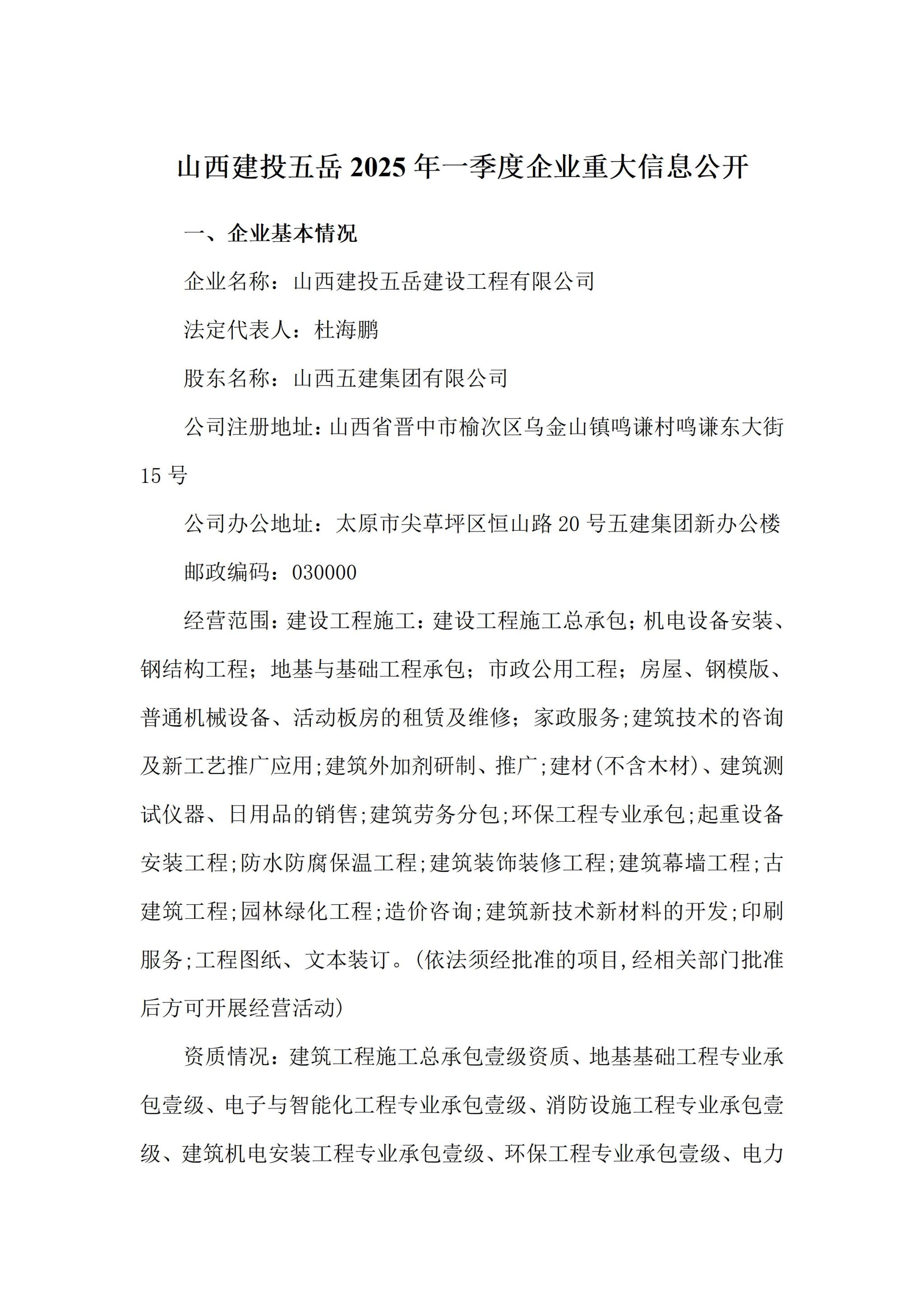 山西建投五岳建设工程有限公司2025年一季度企业重大信息果真
