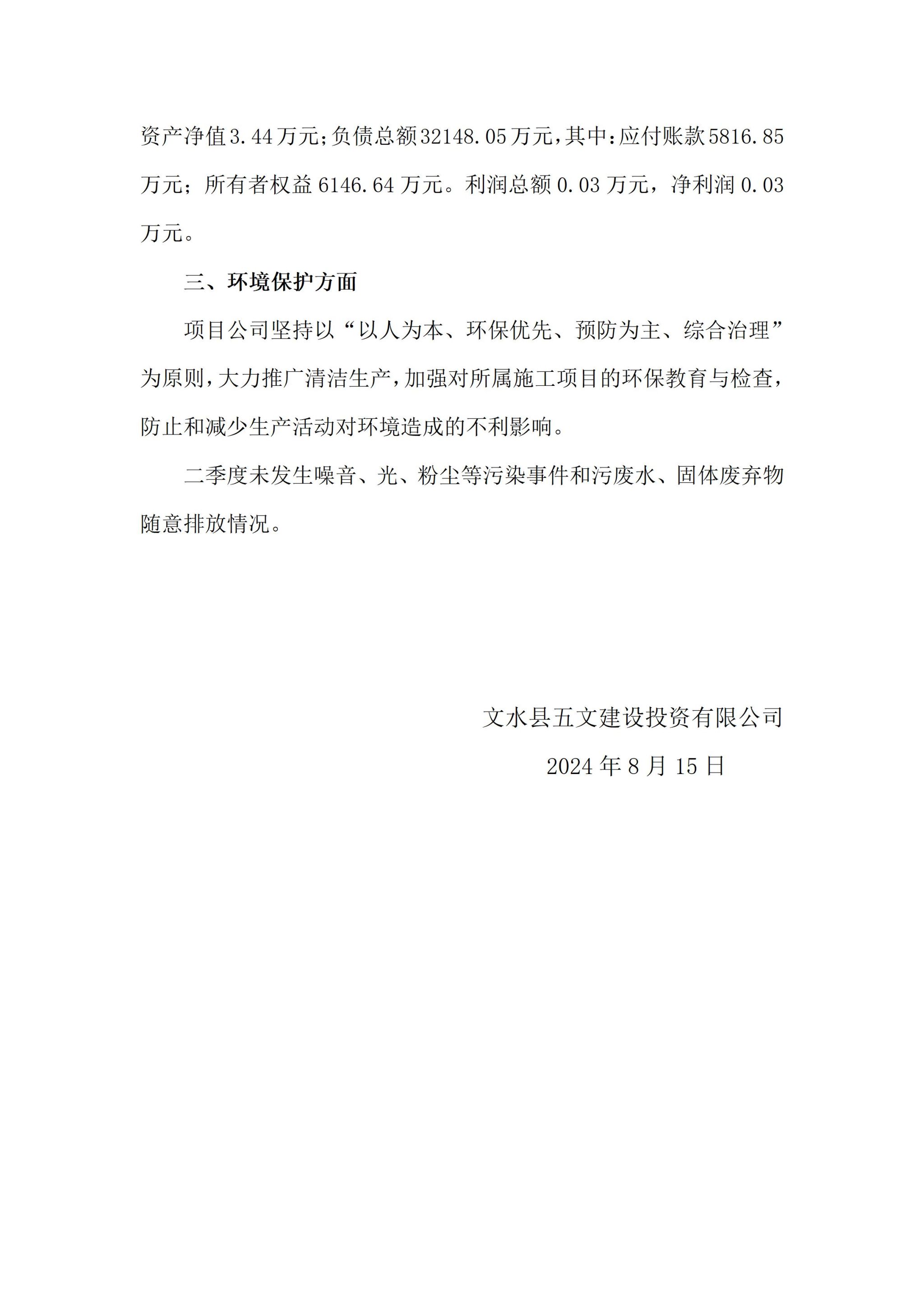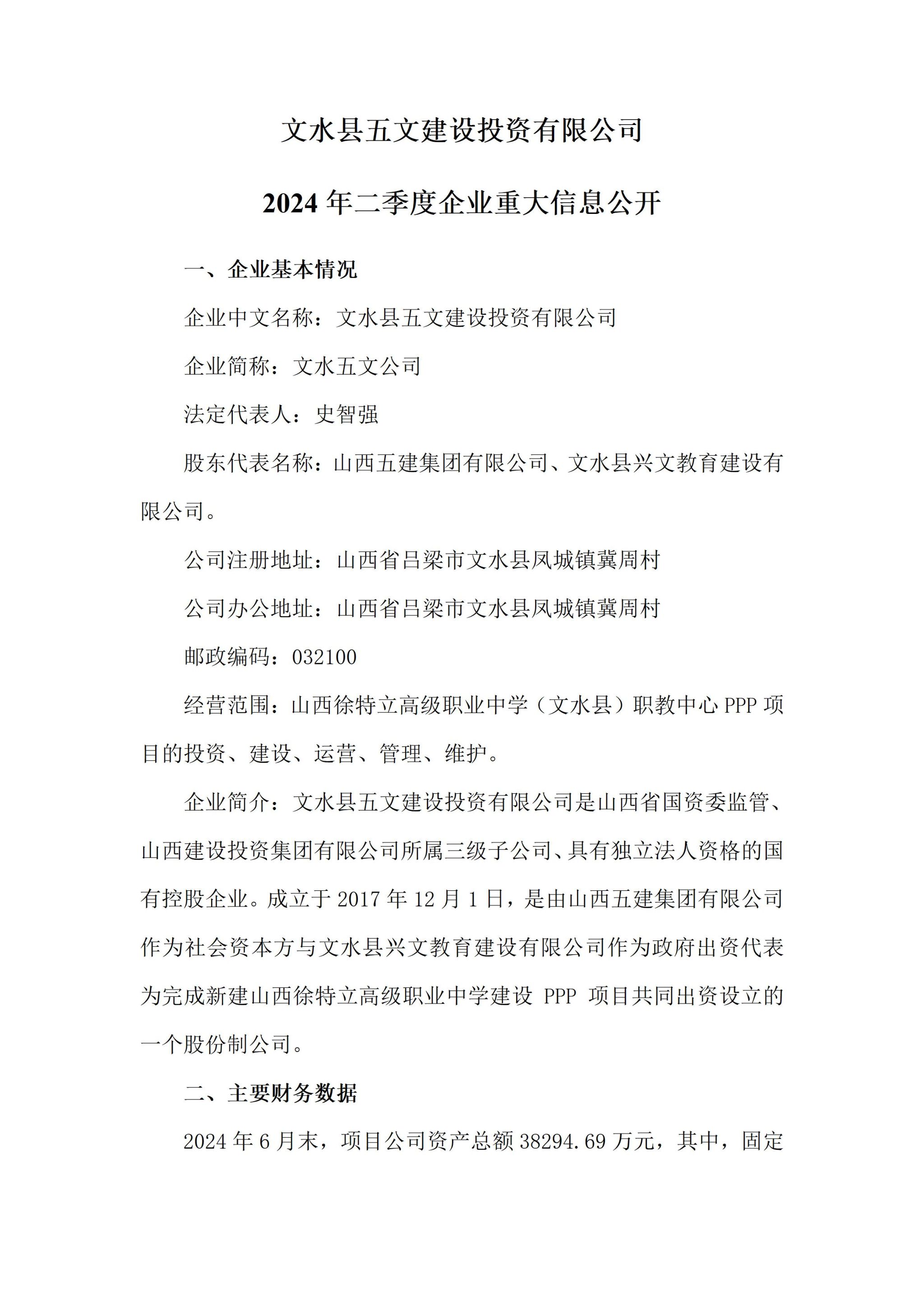 文水县五文建设投资有限公司2024年二季度企业重大信息果真