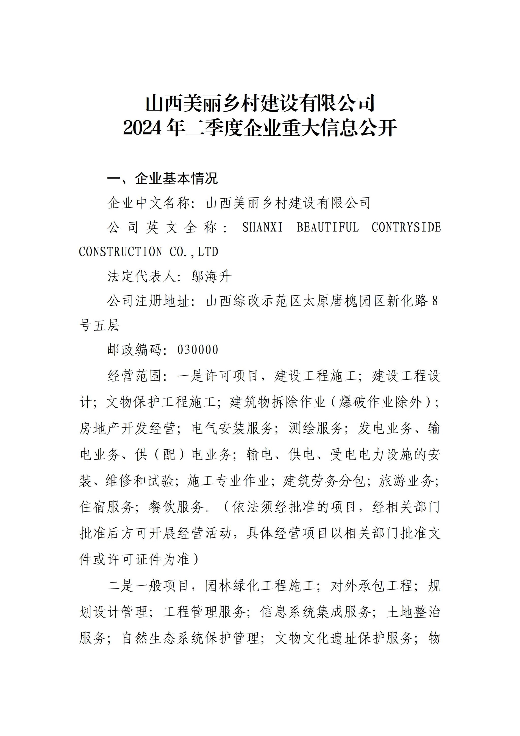 山西漂亮墟落建设有限公司2024年二季度企业重大信息果真