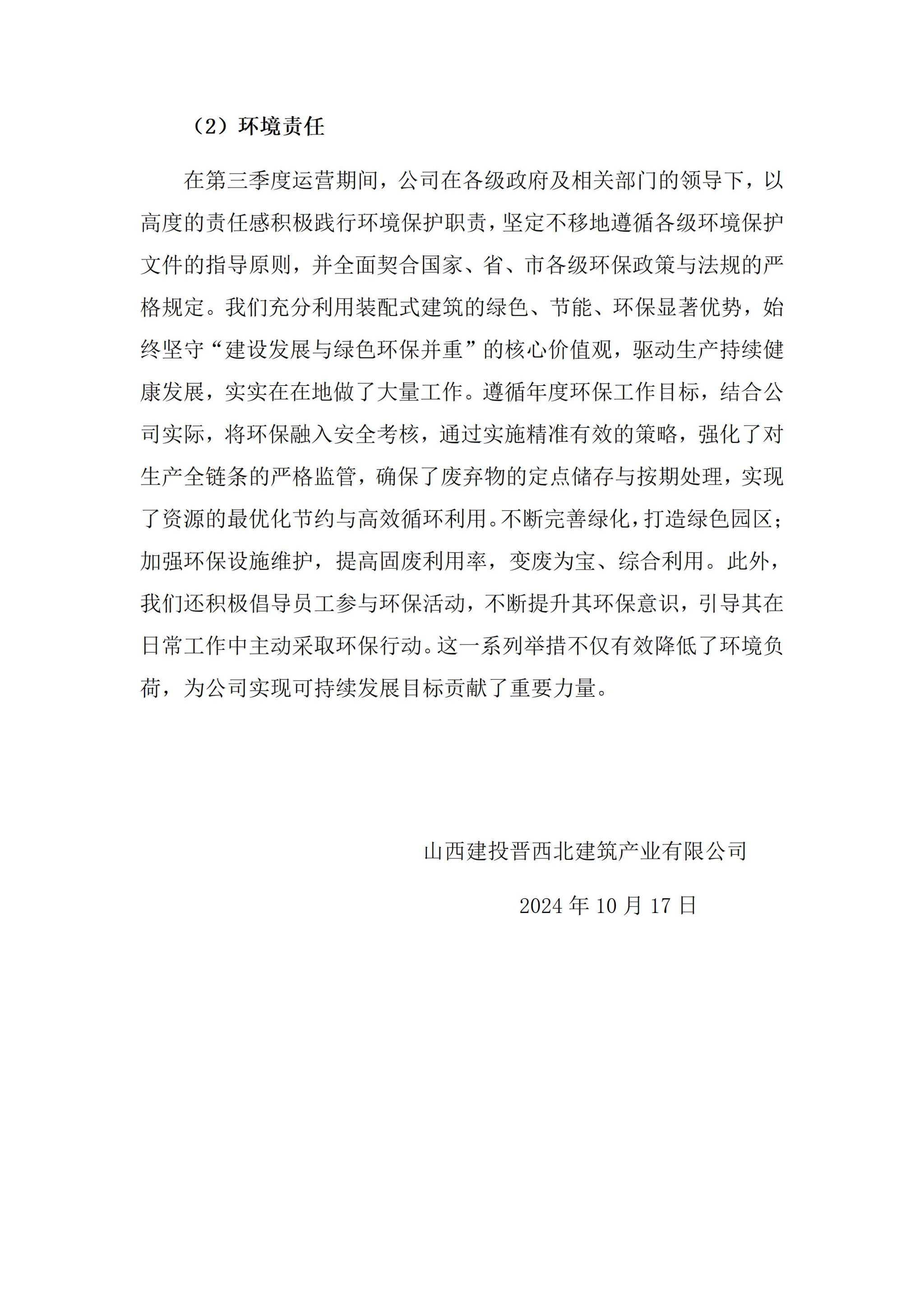 山西建投晋西北修建工业有限公司2024年三季度重大信息果真